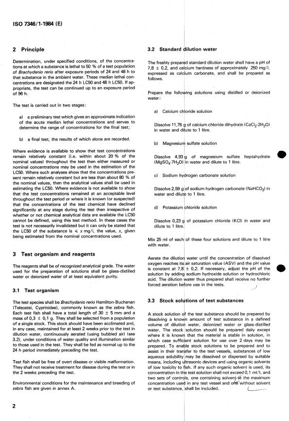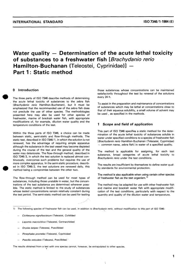 ISO 7346-1:1984 is a standard published by the International Organization for Standardization (ISO). Its full title is "Water quality — Determination of the acute lethal toxicity of substances to a freshwater fish (Brachydanio rerio, Hamilton-Buchanan (Teleostei, Cyprinidae)) — Part 1: Static method". This standard covers: Water quality — Determination of the acute lethal toxicity of substances to a freshwater fish (Brachydanio rerio, Hamilton-Buchanan (Teleostei, Cyprinidae)) — Part 1: Static method