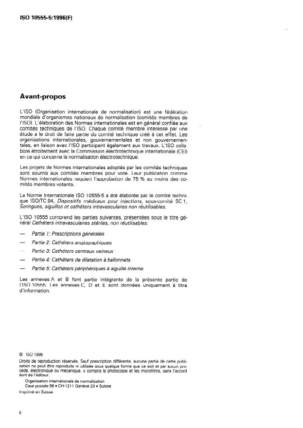 ISO 10555-5:1996 is a standard published by the International Organization for Standardization (ISO). Its full title is "Sterile, single-use intravascular catheters — Part 5: Over-needle peripheral catheters". This standard covers: La présente partie de l'ISO 10555 fixe les prescriptions relatives aux cathéters intravasculaires périphériques à aiguille interne, non réutilisables, conçus pour permettre l'accès au système vasculaire périphérique, fournis stériles. NOTE 1 L'attention est attirée sur l'ISO 11070, qui fixe les prescriptions relatives aux dispositifs accessoires pour utilisation avec les cathéters intravasculaires.