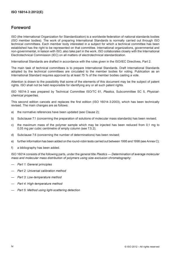 ISO 16014-3:2012 is a standard published by the International Organization for Standardization (ISO). Its full title is "Plastics — Determination of average molecular mass and molecular mass distribution of polymers using size-exclusion chromatography — Part 3: Low-temperature method". This standard covers: ISO 16014-3:2012 specifies a method for determining the average molecular mass and the molecular mass distribution of polymers by size-exclusion chromatography (SEC) using an organic eluent at a temperature lower than 60 °C. The average molecular mass and the molecular mass distribution are calculated from a calibration curve prepared using polymer standards. Therefore, this test method is classified as a relative method.
