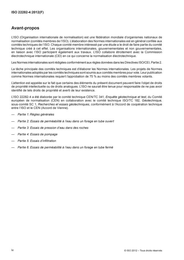 ISO 22282-4:2012 is a standard published by the International Organization for Standardization (ISO). Its full title is "Geotechnical investigation and testing — Geohydraulic testing — Part 4: Pumping tests". This standard covers: ISO 22282-4:2012 establishes requirements for pumping tests as part of geotechnical investigation service in accordance with EN 1997-1 and EN 1997-2. ISO 22282-4:2012 applies to pumping tests performed on aquifers whose permeability is such that pumping from a well can create a lowering of the piezometric head within hours or days depending on the ground conditions and the purpose. It covers pumping tests carried out in soils and rock. The tests concerned by ISO 22282-4:2012 are those intended for evaluating the hydrodynamic parameters of an aquifer and well parameters.