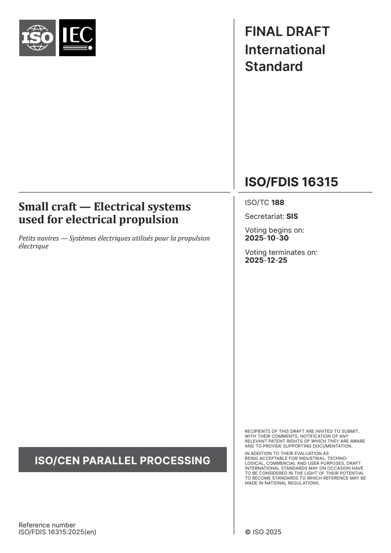 ISO/FDIS 16315 - Small craft — Electrical systems used for electrical propulsion Released:10/16/2025
