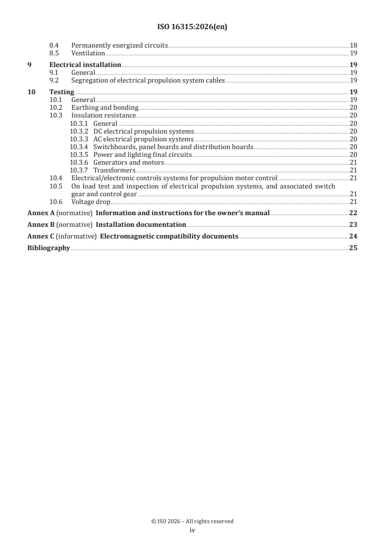 ISO 16315:2026 is a standard published by the International Organization for Standardization (ISO). Its full title is "Small craft — Electrical systems used for electrical propulsion". This standard covers: This document specifies the design and installation of alternating current (AC) and direct current (DC) electrical systems used for the purpose of electrical propulsion and/or the electrical part of a hybrid propulsion system (system with both a rechargeable battery and a fuelled power source). This document is applicable to electrical propulsion systems operated in the following ranges either individually or in combination: direct current of less than 1 500 V DC; single-phase alternating current up to AC 1 000 V; three-phase alternating current up to AC 1 000 V. This document is applicable to electrical propulsion systems installed in small craft up to 24 m length of the hull (LH in accordance with ISO 8666).