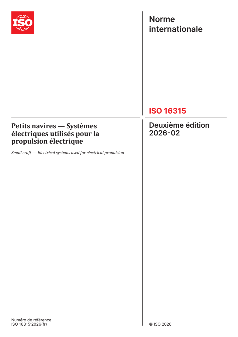 ISO 16315:2026 - Petits navires — Systèmes électriques utilisés pour la propulsion électrique Released:6. 02. 2026
