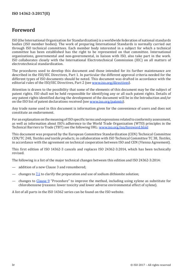 ISO 14362-3:2017 is a standard published by the International Organization for Standardization (ISO). Its full title is "Textiles - Methods for determination of certain aromatic amines derived from azo colorants - Part 3: Detection of the use of certain azo colorants, which may release 4-aminoazobenzene". This standard covers: Azo colorants that are able to form 4-aminoazobenzene, generate under the conditions of ISO 14362-1, the amines aniline and 1,4-phenylenediamine. The presence of these 4-aminoazobenzene colorants cannot be reliably ascertained without additional information (e.g. the chemical structure of the colorant used) or without a special procedure. ISO 14362-3:2017 is supplementary to ISO 14362-1 and describes a special procedure to detect the use, in commodities, of certain azo colorants, which may release 4-aminoazobenzene, and that are - accessible to reducing agent without extraction, particularly concerning textiles made of cellulose and protein fibres (e.g. cotton, viscose, wool, silk), and - accessible by extracting the fibres (e.g. polyester or imitation leather). For certain fibre blends, in 9.3 and 9.4 (with and without extraction) may need to be applied. The procedure also detects 4-aminoazobenzene (Solvent Yellow 1), which is already available as free amine in commodities without reducing pre-treatment. The use of certain azo colorants, which may release, by reductive cleavage of their azo group(s), one or more of the other aromatic amines listed in the Regulation (EC) No 1907/2006 of the European Parliament and of the Council on the Registration, Evaluation, Authorization and Restriction of Chemicals (REACH) as regards Annex XVII, except 4-aminoazobenzene, cannot be determined quantitatively with this method.