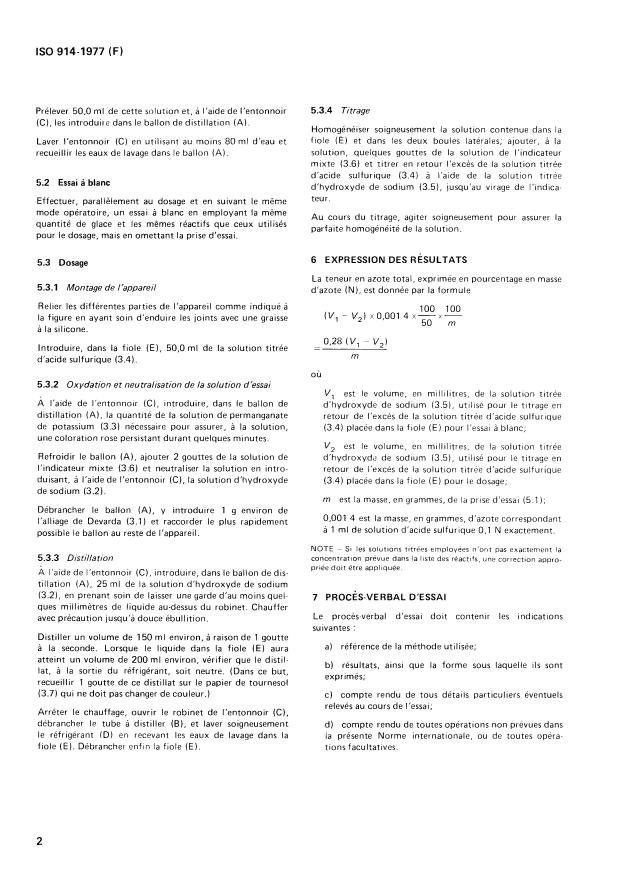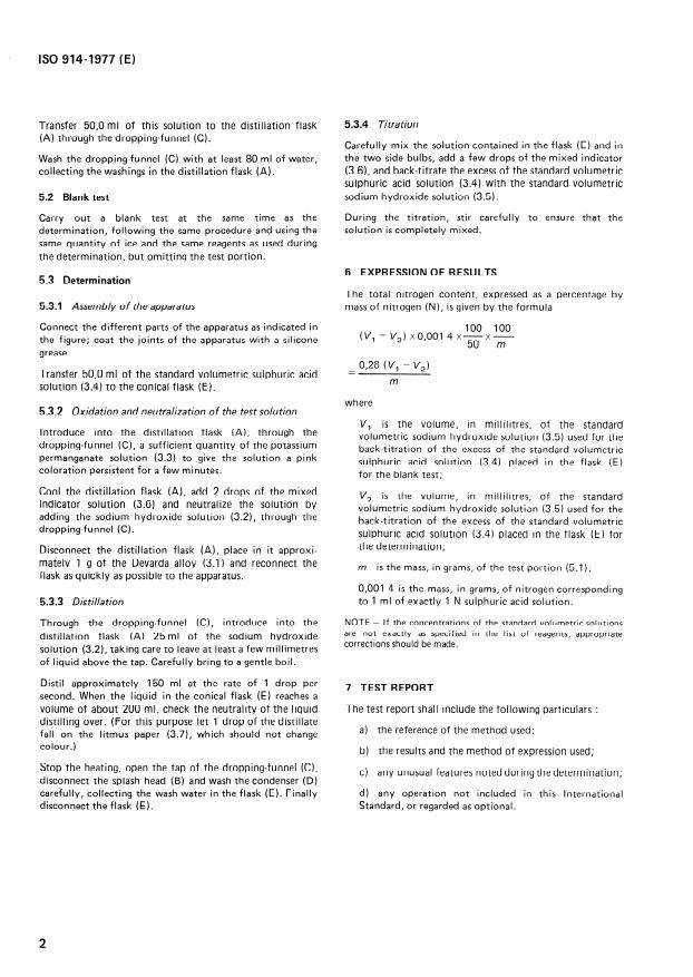 ISO 914:1977 is a standard published by the International Organization for Standardization (ISO). Its full title is "Sulphuric acid and oleum for industrial use — Determination of total nitrogen content — Titrimetric method after distillation". This standard covers: The method is applicable to products having a total nitrogen content equal to or greater than 0.05 % (m/m). The principle consists in the conversion of the nitrogen present in a test portion to ammonia by means of nascent hydrogen. Distillation and absorption of the ammonia in an excess of standard volumetric sulphuric acid solution, and back-titration with a standard volumetric sodium hydroxide solution in the presence of an indicator. - Replaces ISO Recommendation R 914-1968.