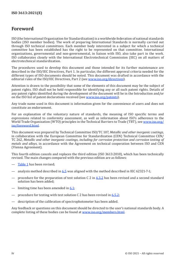 ISO 3613:2021 is a standard published by the International Organization for Standardization (ISO). Its full title is "Metallic and other inorganic coatings — Chromate conversion coatings on zinc, cadmium, aluminium-zinc alloys and zinc-aluminium alloys — Test methods". This standard covers: This document specifies methods for the determination of — the presence of colourless chromate conversion coatings, — the presence of hexavalent chromium in colourless and coloured coatings on zinc or cadmium or aluminium-zinc (mass fraction of aluminium: 55 %, within a range of 54 % to 56 % mass fraction) and zinc-aluminium (mass fraction of aluminium: 5 %) alloys, — the total chromium content per unit area on zinc and cadmium, — the mass per unit area of both colourless and coloured coatings, — the satisfactory adhesion of chromate conversion coatings, and — the quality of chromate coatings. These methods are applicable to — colourless and coloured chromate conversion coatings containing trivalent and hexavalent chromium in varying proportions and produced by either chemical or electrochemical processes, and — chromate coatings that are free from any supplementary coatings, such as oil, water or solvent-based polymers or wax.