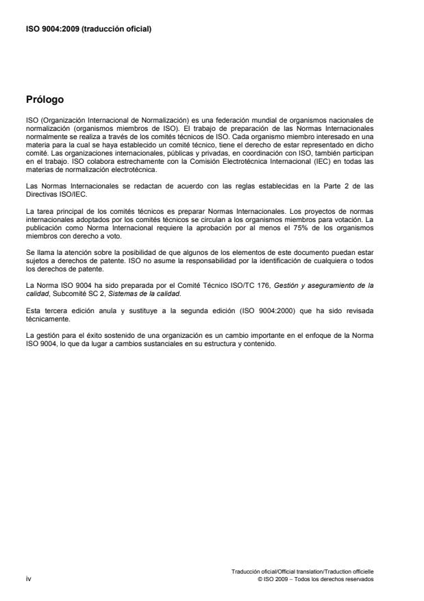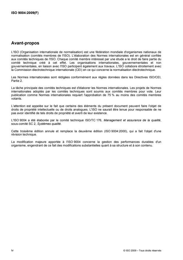 L'ISO 9004:2009 fournit des lignes directrices permettant aux organismes de réaliser des performances durables par une approche de management par la qualité. Elle s'applique à tout organisme, quels que soient sa taille, son type et son activité. L'ISO 9004:2009 n'est pas destinée à être utilisée dans un cadre réglementaire, contractuel ou de certification.
