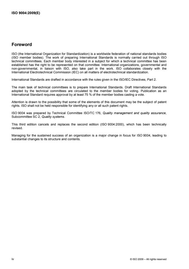 ISO 9004:2009 is a standard published by the International Organization for Standardization (ISO). Its full title is "Managing for the sustained success of an organization — A quality management approach". This standard covers: ISO 9004:2009 provides guidance to organizations to support the achievement of sustained success by a quality management approach. It is applicable to any organization, regardless of size, type and activity. ISO 9004:2009 is not intended for certification, regulatory or contractual use.