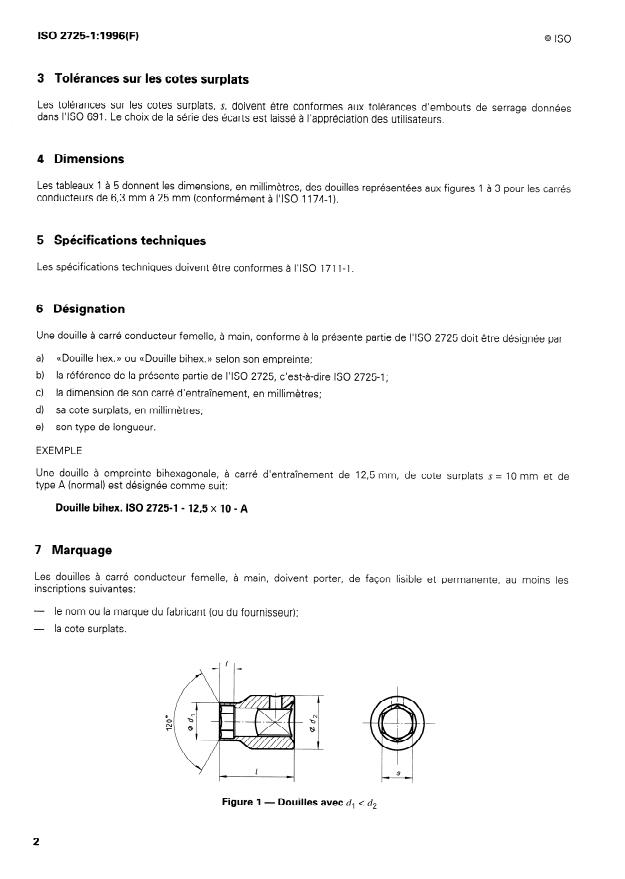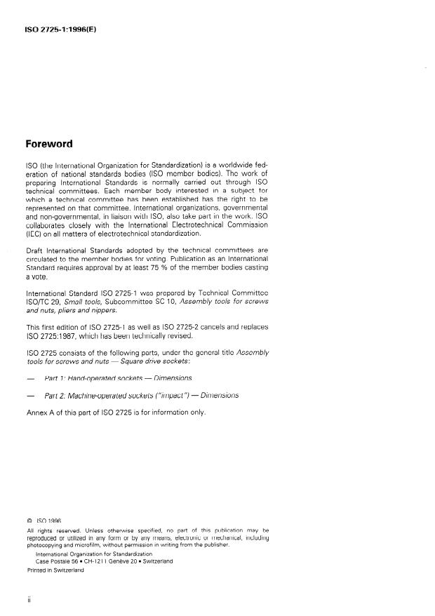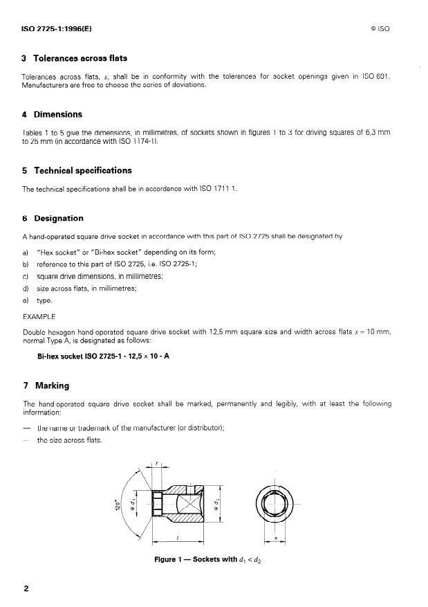 ISO 2725-1:1996 is a standard published by the International Organization for Standardization (ISO). Its full title is "Assembly tools for screws and nuts — Square drive sockets — Part 1: Hand-operated sockets — Dimensions". This standard covers: Specifies dimensions, technical specifications, designation and marking of machine-operated square drive socket wrenches as listed under number 24 in ISO 1703.