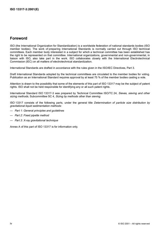 ISO 13317-3:2001 - "Determination of particle size distribution by gravitational liquid sedimentation methods - Part 3: X‑ray gravitational technique" specifies a laboratory method for measuring particle size distribution of powders dispersed in a liquid using an X‑ray gravitational sedimentation approach. The method is applicable to powders or slurries with particles of similar chemical composition and sufficient X‑ray opacity. Typical measurable particle sizes are about 0.5 µm to 100 µm. The standard complements Parts 1 and 2 in the ISO 13317 series and includes procedural and reporting requirements.