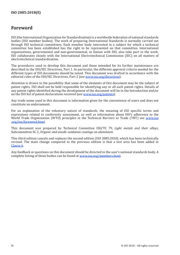 ISO 2085:2018 is a standard published by the International Organization for Standardization (ISO). Its full title is "Anodizing of aluminium and its alloys — Check for continuity of thin anodic oxidation coatings — Copper sulfate test". This standard covers: This document specifies a method for checking the continuity of thin anodic oxidation coatings on aluminium and its alloys by a copper sulfate contact test. The use of this method is limited to anodic oxidation coatings of thickness less than 5 µm or coatings that have been deformed, which includes those produced by coil anodizing techniques. NOTE The method described enables a rapid check to be made for the continuity of a thin coating of aluminium oxidation on aluminium and its alloys. In cases of doubt regarding a visible fault on the surface of a coating, the use of this method makes it possible to verify whether the fault corresponds to a local gap in the coating that exposes bare metal.