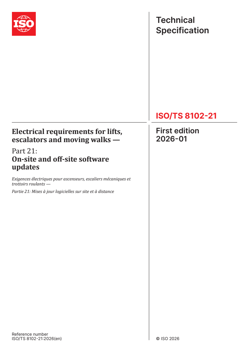 ISO/TS 8102-21:2026 - Electrical requirements for lifts, escalators and moving walks — Part 21: On-site and off-site software updates Released:8/26/2025