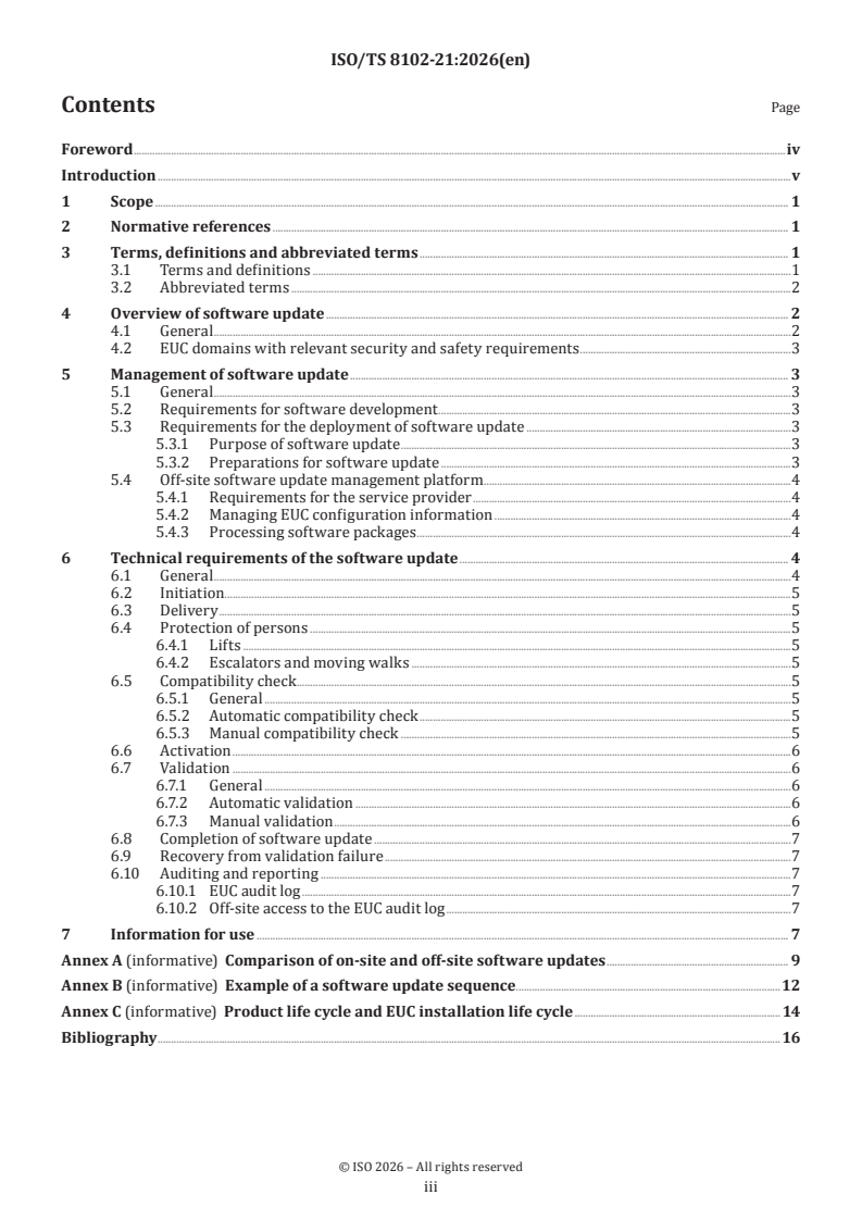 Keywords: ISO/TS 8102-21, software updates, lifts, escalators, moving walks, EUC, on-site updates, off-site updates, software package, validation, activation, compatibility check, update management.