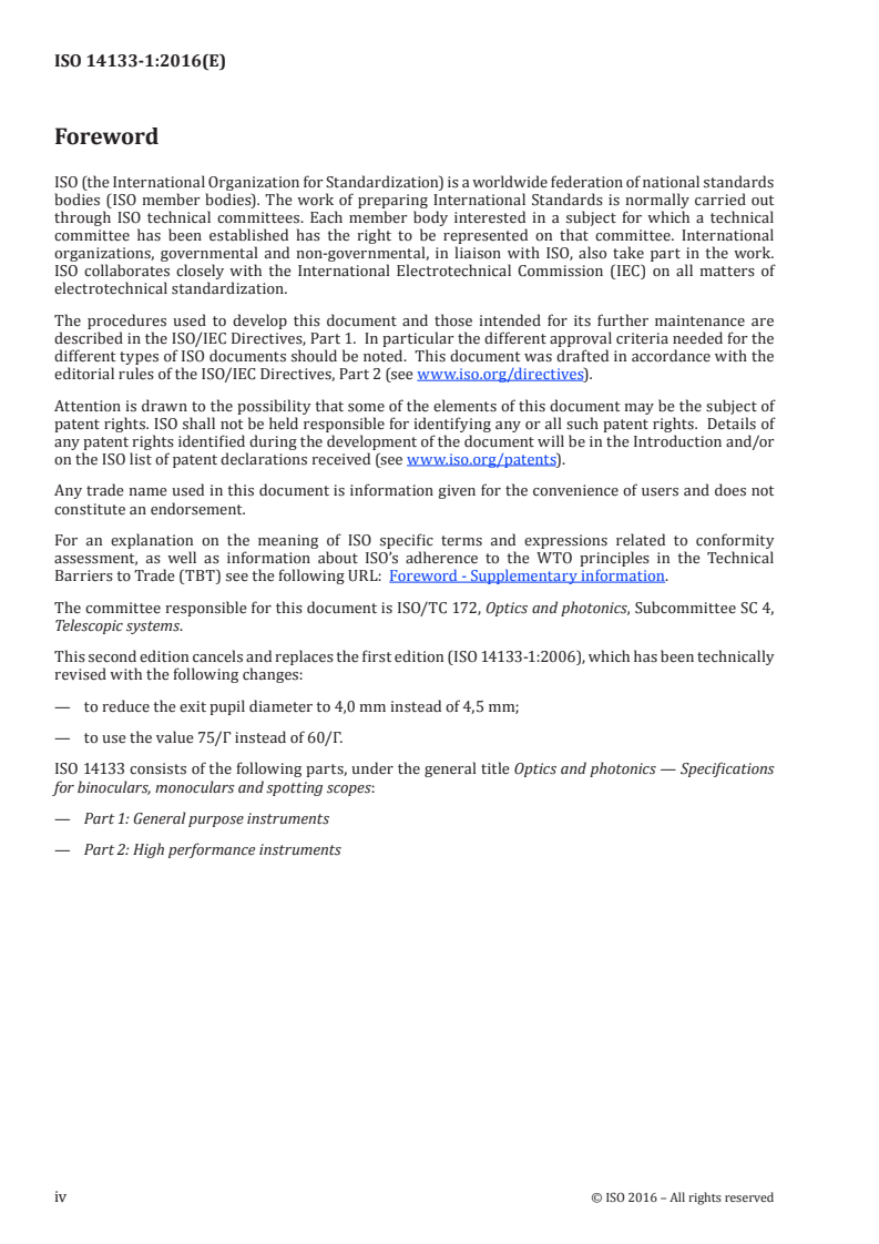 ISO 14133-1:2016 is a standard published by the International Organization for Standardization (ISO). Its full title is "Optics and photonics - Specifications for binoculars, monoculars and spotting scopes - Part 1: General purpose instruments". This standard covers: ISO 14133-1:2016 gives requirements for general purpose binoculars, monoculars and spotting scopes. It is not applicable to high performance binoculars, monoculars and spotting scopes, which are specified in ISO 14133‑2.