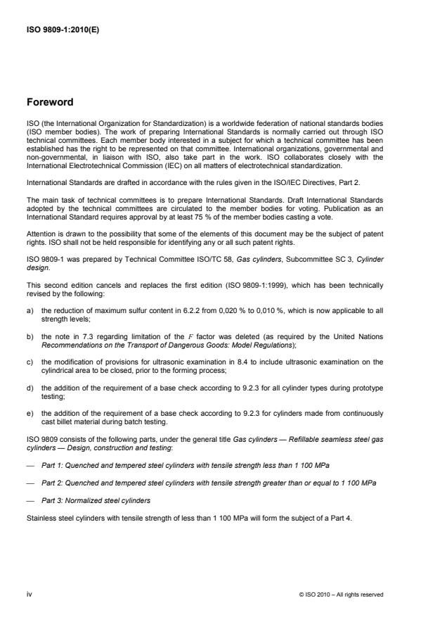 ISO 9809-1:2010 is a standard published by the International Organization for Standardization (ISO). Its full title is "Gas cylinders - Refillable seamless steel gas cylinders - Design, construction and testing - Part 1: Quenched and tempered steel cylinders with tensile strength less than 1 100 MPa". This standard covers: ISO 9809-1:2010 specifies minimum requirements for the material, design, construction and workmanship, manufacturing processes, examination and testing at manufacture of refillable quenched and tempered seamless steel gas cylinders of water capacities from 0,5 l up to and including 150 l for compressed, liquefied and dissolved gases. ISO 9809-1:2010 is applicable to cylinders with a maximum actual tensile strength Rma of less than 1 100 MPa. If desired, cylinders of water capacity less than 0,5 l and between 150 l and 500 l can be manufactured and certified to be in compliance with ISO 9809-1:2010.