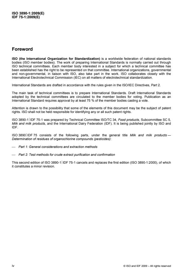 ISO 3890-1:2009 is a standard published by the International Organization for Standardization (ISO). Its full title is "Milk and milk products - Determination of residues of organochlorine compounds (pesticides) - Part 1: General considerations and extraction methods". This standard covers: ISO 3890-1|IDF 75-1:2009 describes general considerations and specifies extraction methods for the determination of residues of organochlorine pesticides in milk and milk products. A method for high-fat products is specified in an annex. Guidance is given on the conduct of analyses in the presence of polychlorinated biphenyls (PCBs) in another annex. The methods are applicable to: alpha-HCH; beta-HCH; gamma-HCH; aldrin/dieldrin; heptachlor and heptachlorepoxide; isomers of DDT, DDE, TDE; chlordane and oxychlordane; and endrin. Certain methods are applicable to delta-ketoendrin and HCB.