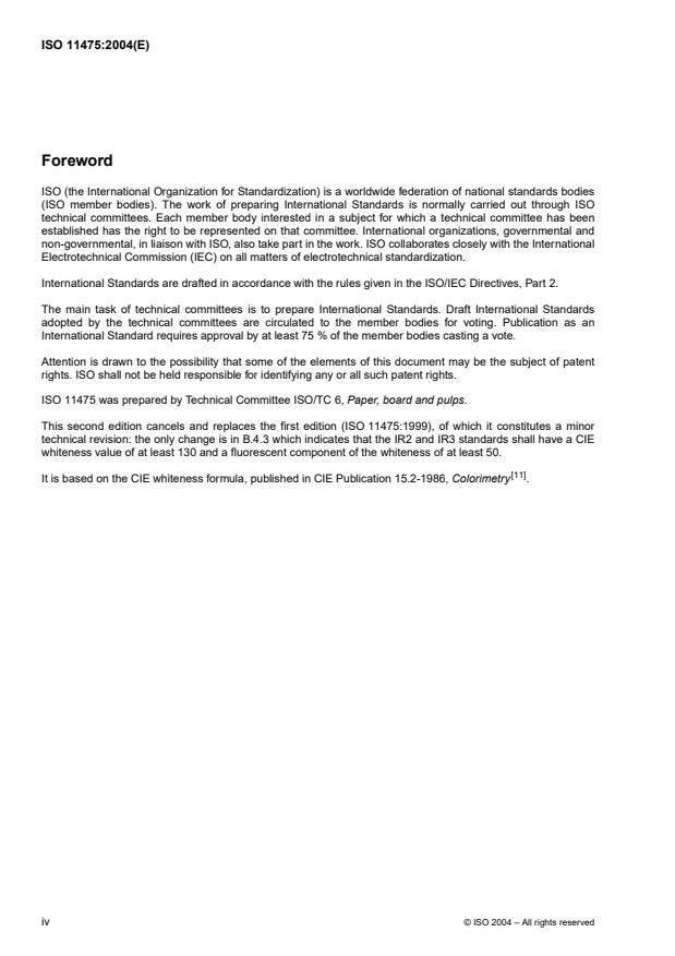 ISO 11475:2004 specifies the procedure to be used for determining the whiteness of papers and boards. The values obtained correspond to the visual appearance of white papers and boards with or without fluorescent whitening agents when they are viewed under the CIE D65 daylight illuminant. It is based on reflectance data obtained over the full visible spectral range (VIS) in contrast to the measurement of ISO brightness which is limited to the blue region of VIS. In addition, it specifies a method for adjustment of the UV-content to correspond to the D65 daylight illuminant , insofar as results obtained when fluorescent whitening agents are present are dependent upon the UV-content of the radiation falling upon the sample. It is specific for the measurement of fluorescence in the blue region of the spectrum. This method is not applicable to coloured papers containing fluorescent dyes. It should be read in conjunction with ISO 2469.