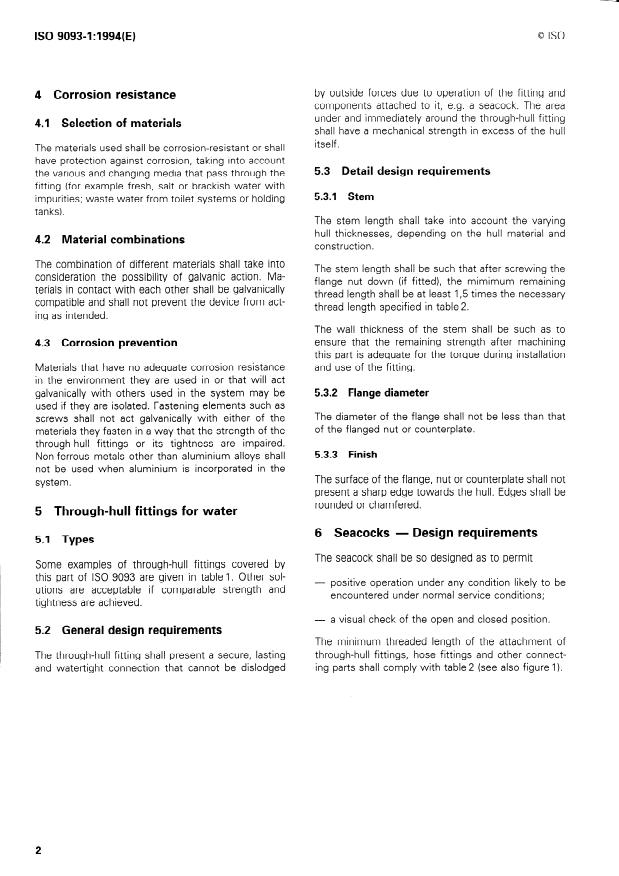ISO 9093-1:1994 is a standard published by the International Organization for Standardization (ISO). Its full title is "Small craft — Seacocks and through-hull fittings — Part 1: Metallic". This standard covers: Specifies requirements for metallic through-hull fittings, seacocks and hose fittings that specifically form part of water intake and discharge lines, and for wet exhaust outlets used in small craft of up to 24 m length of hull. Applies to seacocks and through-hull fittings with cylindrical pipe threads in accordance with ISO 228-1, and with joints for conical pipe threads in accordance with ISO 7-1 with nominal diameters of 1/4, 3/8, 1/2, 3/4, 1, 1 1/4, 1 1/2, 2, 2 1/2, 3 or 4 in.