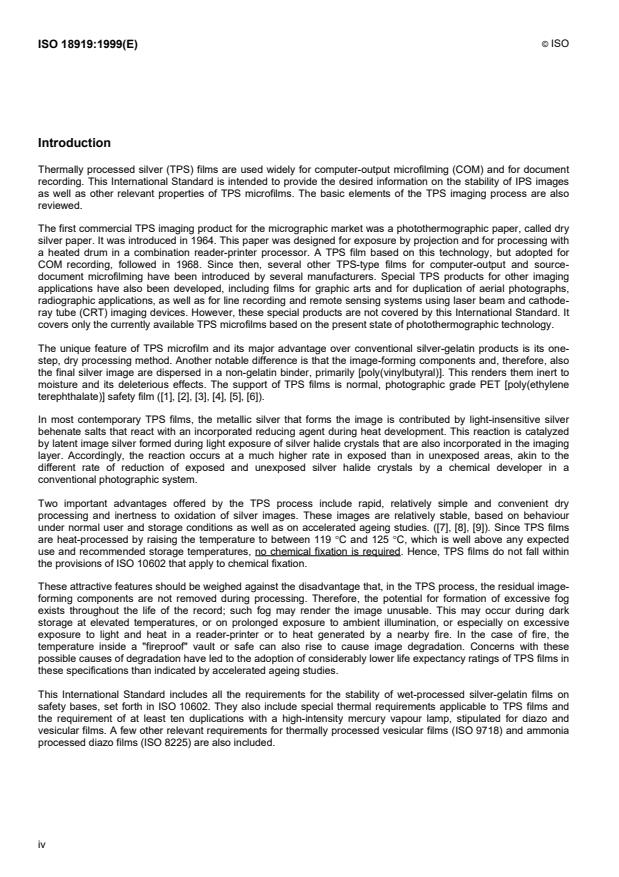 ISO 18919:1999 is a standard published by the International Organization for Standardization (ISO). Its full title is "Imaging materials - Thermally processed silver microfilm - Specifications for stability". This standard covers: This International Standard establishes specifications for the stability of photographic films intended for storage of records; specifically, microfilms with a base of safety polyester [poly(ethylene terephthalate)] having predominantly silver behenate salts dispersed in nongelatinous emulsions, and thermally processed to produce a black-and-white silver image. This International Standard applies to thermally processed silver (TPS) microfilms having ultrasonic or dielectric (induction-heated) splices. It does not cover films with splices made by means of adhesive tape. This International Standard does not cover other types of black-and-white TPS films, black-and-white paper, colour images and colour prints that are produced with thermally processed silver behenate systems. It does not apply to films to which lacquers have been applied. It also does not apply to conventional black-and-white silver images that are produced by wet processing of silvergelatin films (see ISO 10602).