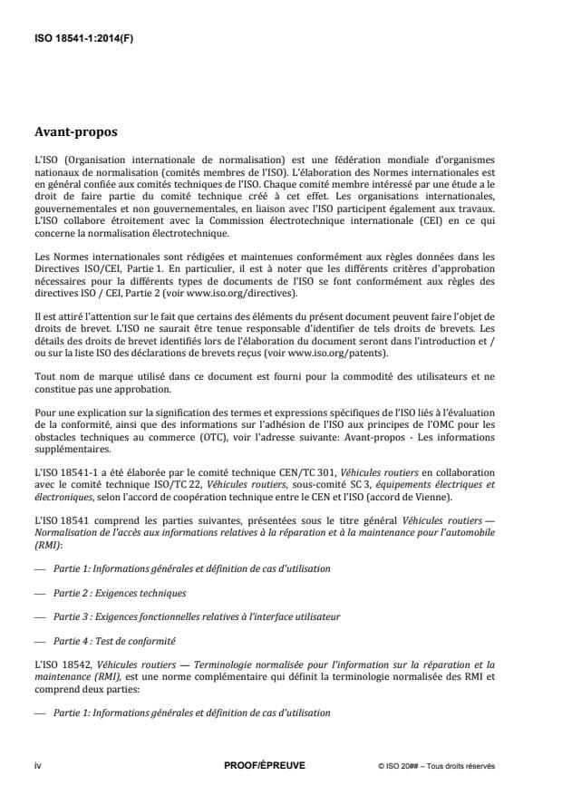 ISO 18541-1:2014 contient des « informations générales » qui donnent un aperçu général et la structure de chaque partie de la norme. Elle spécifie également des « cas d'utilisation » relatifs aux systèmes d'information de réparation et de maintenance (RMI) afin de normaliser l'accès aux RMI pour des opérateurs indépendants. Cette partie de l'ISO 18541 décrit également les cas d'utilisation applicables à l'accès normalisé aux RMI pour l'automobile. Les cas d'utilisation portent sur des scénarios réalistes (par exemple dans le cadre de la maintenance de véhicules) en ce qui concerne l'accès aux informations nécessaire pour l'assistance routière, le contrôle, le diagnostic, la réparation et la maintenance, y compris la mise à jour et le remplacement des Unités de Contrôle Électronique (UCE). Les systèmes RMI utilisés par le personnel pour réaliser les opérations d'entretien comprennent : - un système accessible sur Internet, qui donne accès aux RMI nécessaires pour réaliser la ou les opérations d'entretien ; - la fourniture de coordonnées pour des RMI spécifiques ; - un cadre de mesures destiné à sécuriser l'accès aux informations RMI liées à la sécurité du véhicule. Cette partie de l'ISO 18541 donne un aperçu général de l'ensemble de la norme et de ses modalités d'application à l'industrie automobile. Cette partie de l'ISO 18541 s'applique aux véhicules particuliers et utilitaires légers tels que définis dans le Règlement (CE) 715/2007, Article 2.[15]