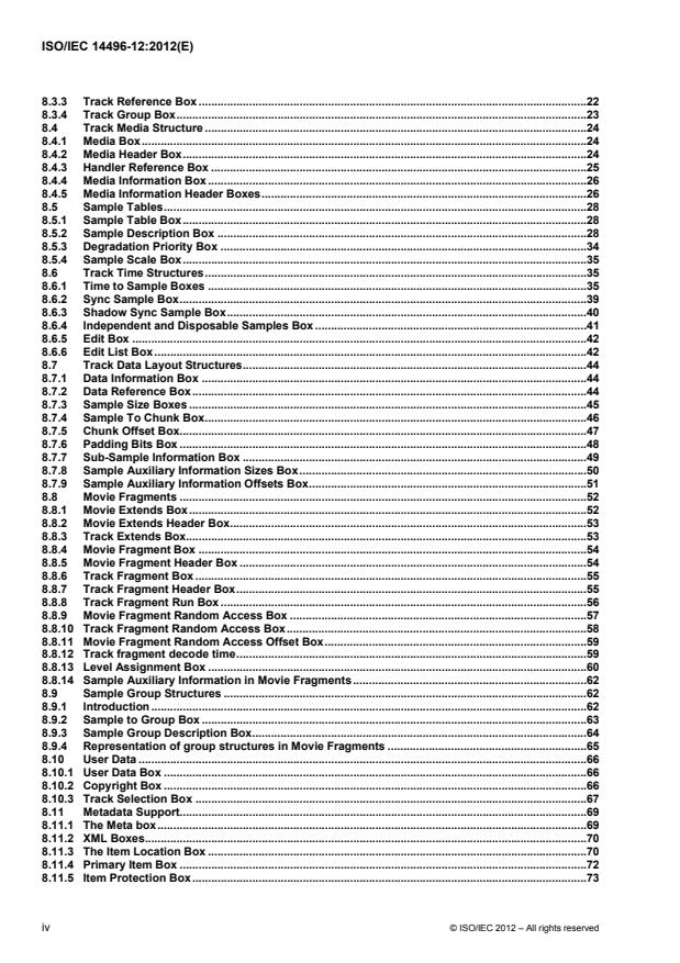 ISO/IEC 14496-12:2012 specifies the structure and uses of the ISO base media file format. The identical text is published as ISO/IEC 15444-12:2012. This file format is used to contain time-based media such as video and audio. The storage of particular coding schemes is defined in specifications that derive from and reference ISO/IEC 14496-12:2012 and ISO/IEC 15444-12:2012, such as the MPEG-4 file format specified in ISO/IEC 14496-14, or the Motion JPEG file format specified in ISO/IEC 15444-3. This file format is designed to contain timed media information for a presentation in a flexible, extensible format that facilitates interchange, management, editing and presentation of the media. This presentation may be "local" to the system containing the presentation, or may be via a network or other stream delivery mechanism. The file format is designed to be independent of any particular network protocol while enabling efficient support for them in general. The file structure is object-oriented; a file can be decomposed into constituent objects very simply, and the structure of the objects inferred directly from their type. This technically identical text is published as ISO/IEC 14496-12:2012 for MPEG-4, and as ISO/IEC 15444-12:2012 for JPEG 2000, and reference to this specification should be made accordingly. The recommendation is to reference one, for example ISO/IEC 14496-12:2012, and append to the reference a parenthetical comment identifying the other, for example "(technically identical to ISO/IEC 15444-12:2012)".