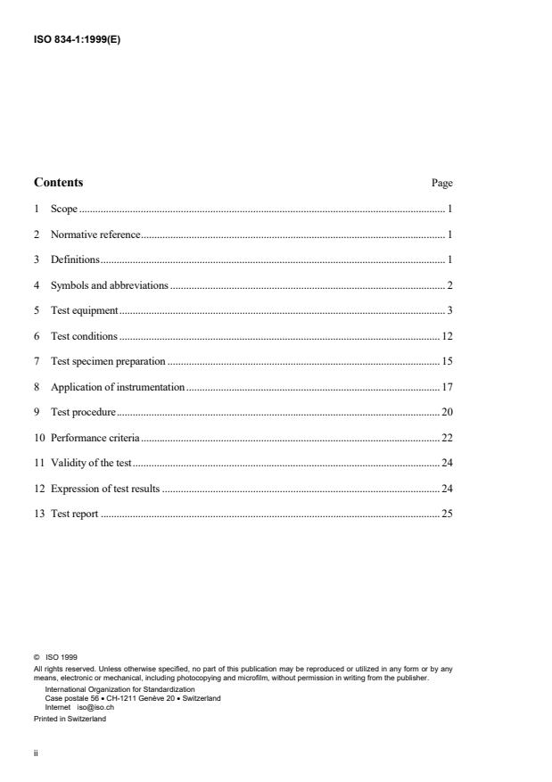 ISO 834-1:1999 is a standard published by the International Organization for Standardization (ISO). Its full title is "Fire-resistance tests - Elements of building construction - Part 1: General requirements". This standard covers: This part of ISO 834 specifies a test method for determining the fire resistance of various elements of construction when subjected to standard fire exposure conditions. The test data thus obtained will permit subsequent classification on the basis of the duration for which the performance of the tested elements under these conditions satisfies specified criteria.