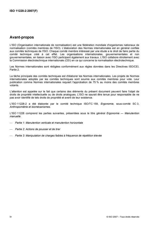 L'ISO 11228-2:2007 recommande des limites pour les actions de pousser et de tirer impliquant tout le corps. Elle fournit des conseils pour l'évaluation des facteurs de risque jugés importants dans l'action de pousser et de tirer manuellement, permettant ainsi d'évaluer les risques pour la santé de la population active. Les recommandations s'appliquent à une population active d'adultes en bonne santé et procurent une protection raisonnable à la majeure partie de cette population. Ces recommandations sont basées sur des études expérimentales menées sur les actions de pousser et tirer et sur les niveaux de charge musculo-squelettique, d'inconfort/douleur et d'endurance/fatigue associés à ces tâches. Les actions de pousser ou de tirer, telles que définies dans l'ISO 11228-2:2007, sont limitées à des efforts mobilisant le corps tout entier (debout/en marchant); des actions réalisées par une seule personne; des forces appliquées par les deux mains; des forces employées pour déplacer ou retenir un objet; des forces appliquées de façon régulière et contrôlée; des forces appliquées sans utiliser de support(s) externe(s); des forces appliquées sur des objets situés en face de l'opérateur; et des forces appliquées en position debout (pas assise). L'ISO 11228-2:2007 s'adresse aux concepteurs, employeurs, employés et autres parties impliquées dans la conception ou la refonte du travail, des tâches, des produits et de l'organisation du travail.