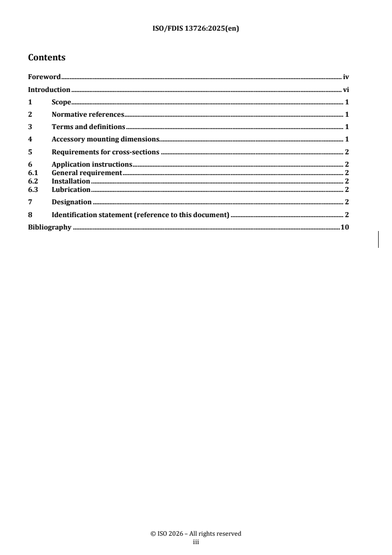 - Designation and identification: accessories are designated by ISO 6099 mounting code followed by “ISO 13726” and the type number; a recommended identification statement is provided for catalogs and test reports.