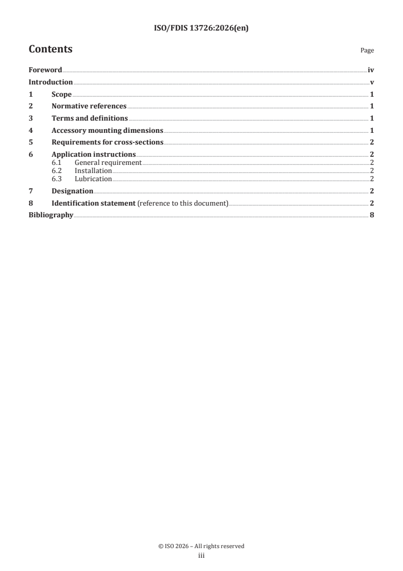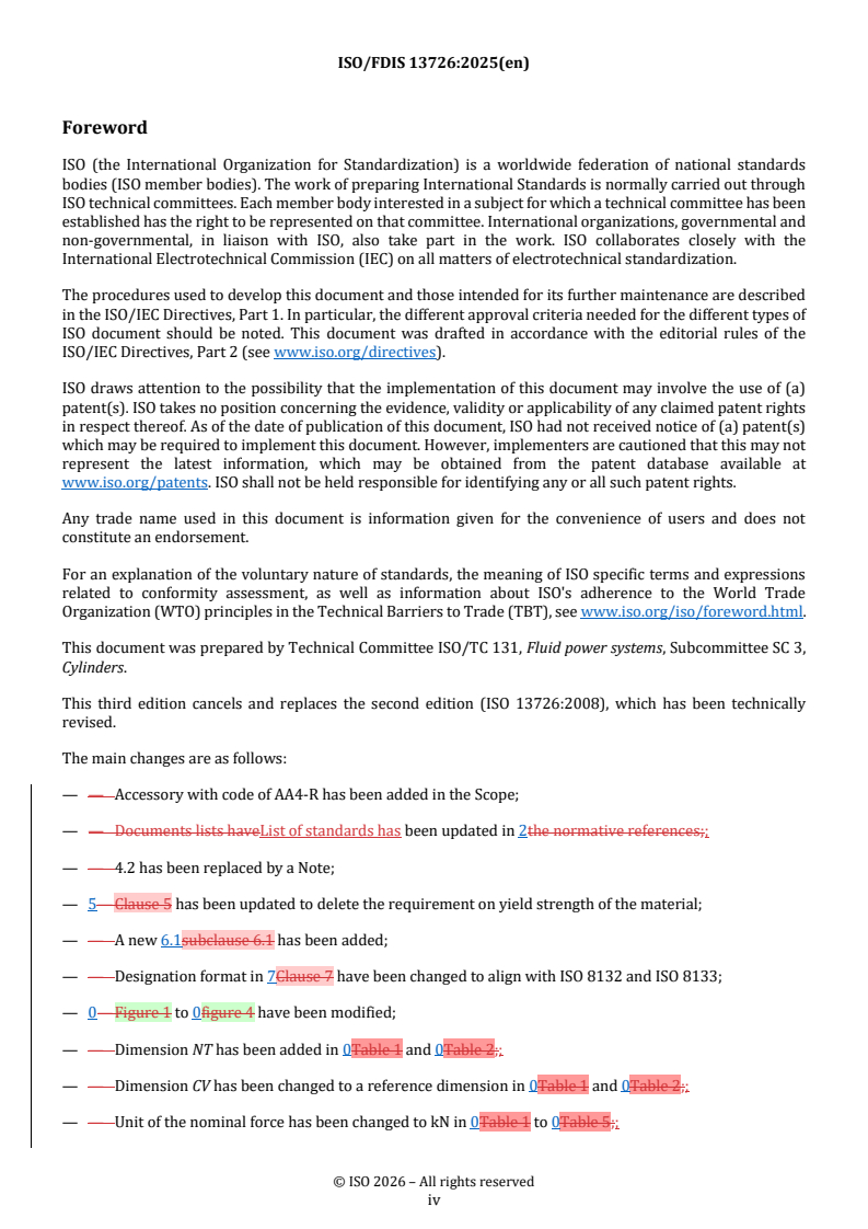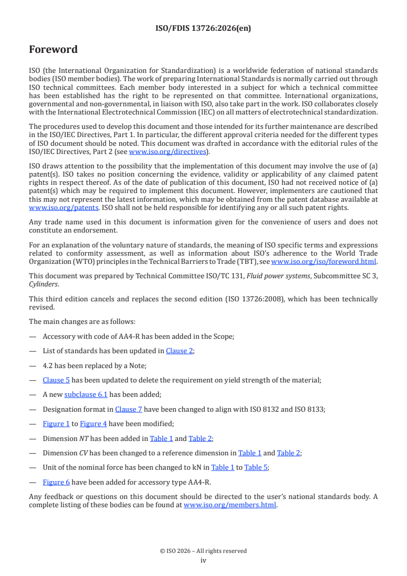 REDLINE ISO/FDIS 13726 - Hydraulic fluid power — Single rod cylinders, 16 MPa (160 bar) compact series with bores from 250 mm to 500 mm — Accessory mounting dimensions Released:22. 12. 2025