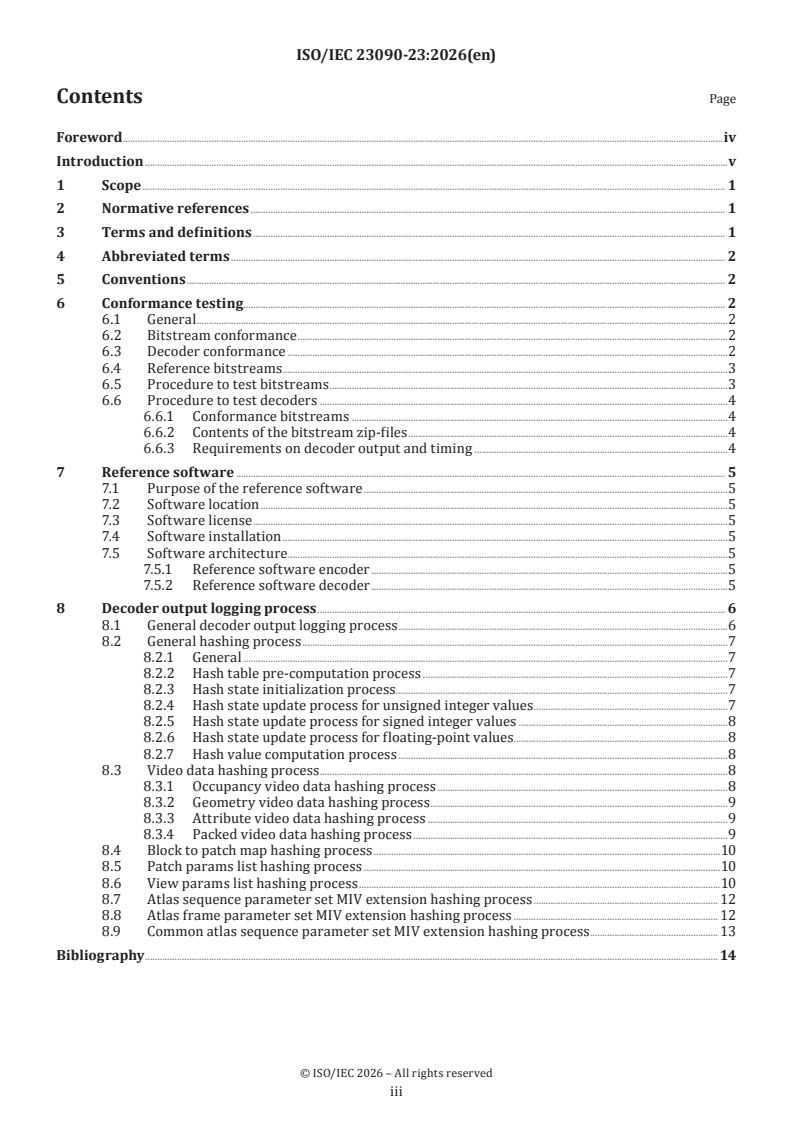 ISO/IEC 23090-23:2026 is a standard published by the International Organization for Standardization (ISO). Its full title is "Information technology — Coded representation of immersive media — Part 23: Conformance and reference software for MPEG immersive video". This standard covers: This document specifies a set of tests and procedures designed to indicate whether encoders or decoders meet the requirements specified in ISO/IEC 23090-12.