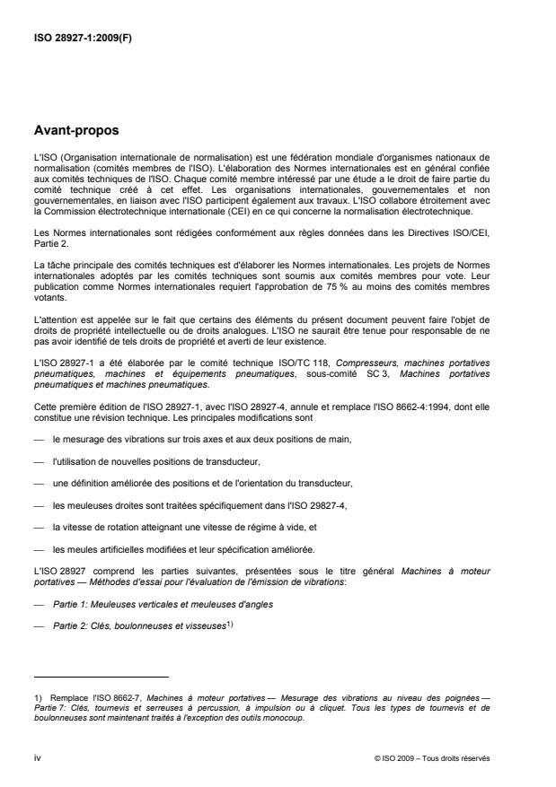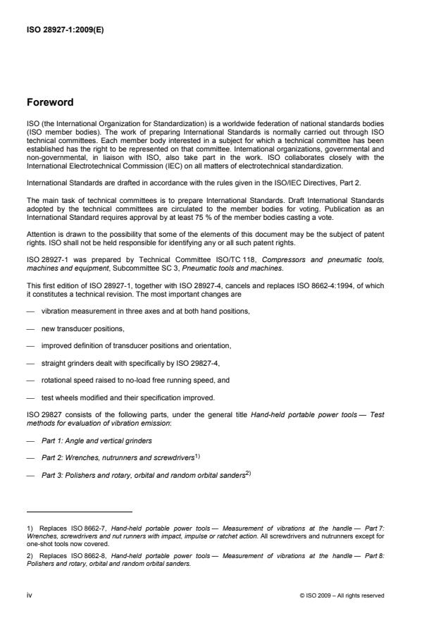 ISO 28927-1:2009 is a standard published by the International Organization for Standardization (ISO). Its full title is "Hand-held portable power tools — Test methods for evaluation of vibration emission — Part 1: Angle and vertical grinders". This standard covers: ISO 28927-1:2009 specifies a laboratory method for measuring hand-transmitted vibration emission at the handles of hand-held power-driven angle and vertical grinders. It is a type-test procedure for establishing the magnitude of vibration in the gripping areas of a machine fitted with a specified test wheel and run under no‑load conditions. The method has been established for surface grinding tasks only (cutting and sanding generally create lower vibrations). It is intended that the results be used to compare different models of the same type of machine. ISO 28927-1:2009 is applicable to hand-held machines, driven pneumatically or by other means, intended for grinding, cutting-off and rough sanding, with bonded, coated and super-abrasive products for use on all kinds of materials. It is not applicable to grinders used with wire brushes or to die or straight grinders.