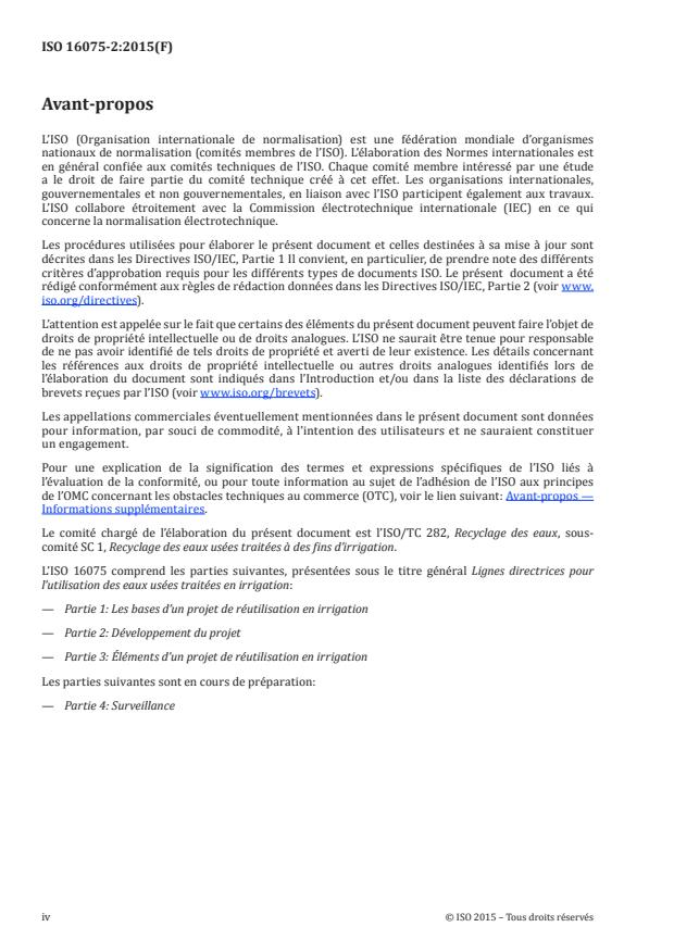 L'ISO 16075-2:2015 traite des points suivants: les critères d'élaboration de projets d'irrigation utilisant des eaux usées traitées (abrégées en EUT), qui visent à prévenir les risques sanitaires pour la population qui a été en contact direct ou indirect avec les EUT ou avec tout produit qui s'est trouvé en contact avec les EUT; la spécification des paramètres suivants: la qualité des EUT pouvant être utilisées en irrigation; les types de cultures pouvant être irrigués par des EUT; la combinaison entre les niveaux de qualité des EUT utilisées en irrigation et les types de cultures qui peuvent être irriguées; la stratégie d'utilisation de barrières qui peuvent réduire les risques liés à l'irrigation par des EUT; la corrélation entre la qualité des EUT, les cultures irriguées et les types de barrières qui peuvent être utilisés; la distance requise entre les aires irriguées par des EUT et les zones résidentielles.