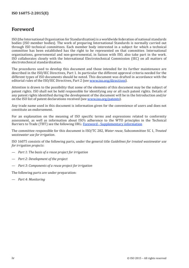 ISO 16075-2:2015 is a standard published by the International Organization for Standardization (ISO). Its full title is "Guidelines for treated wastewater use for irrigation projects — Part 2: Development of the project". This standard covers: ISO 16075-2:2015 covers the following issues: criteria for the design of treated wastewater (herinafter: TWW) irrigation projects intended to prevent public health risks within the population that has been in direct or indirect contact with the TWW or with any product that has come in contact with the TWW; specifications of the following: the quality of the TWW that can be used for irrigation; the types of crops that can be irrigated with TWW; the combination of the qualities of the irrigated TWW and the types of crops that can be irrigated; the strategy of using barriers that can reduce the risks that arise from TWW irrigation; the correlation between the quality of the TWW, the irrigated crops, and the types of barriers that can be used; the distance required between the TWW irrigation areas and residential areas.