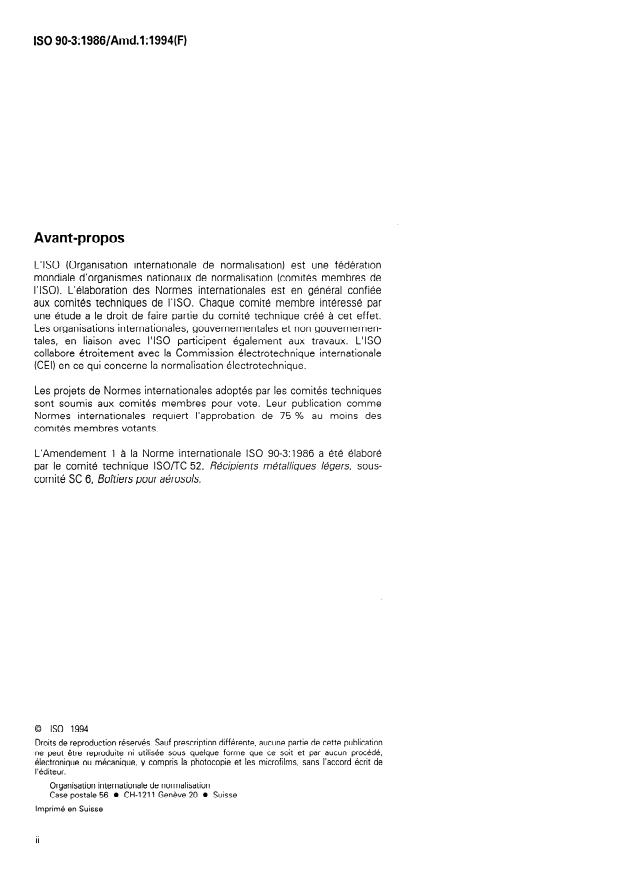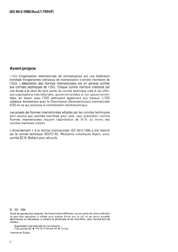 ISO 90-3:1986/Amd 1:1994 is a standard published by the International Organization for Standardization (ISO). Its full title is "Light gauge metal containers — Definitions and determination methods for dimensions and capacities — Part 3: Aerosol cans — Amendment 1: Dimensions of the top end of three-piece necked-in tinplate cans". This standard covers: Light gauge metal containers — Definitions and determination methods for dimensions and capacities — Part 3: Aerosol cans — Amendment 1: Dimensions of the top end of three-piece necked-in tinplate cans
