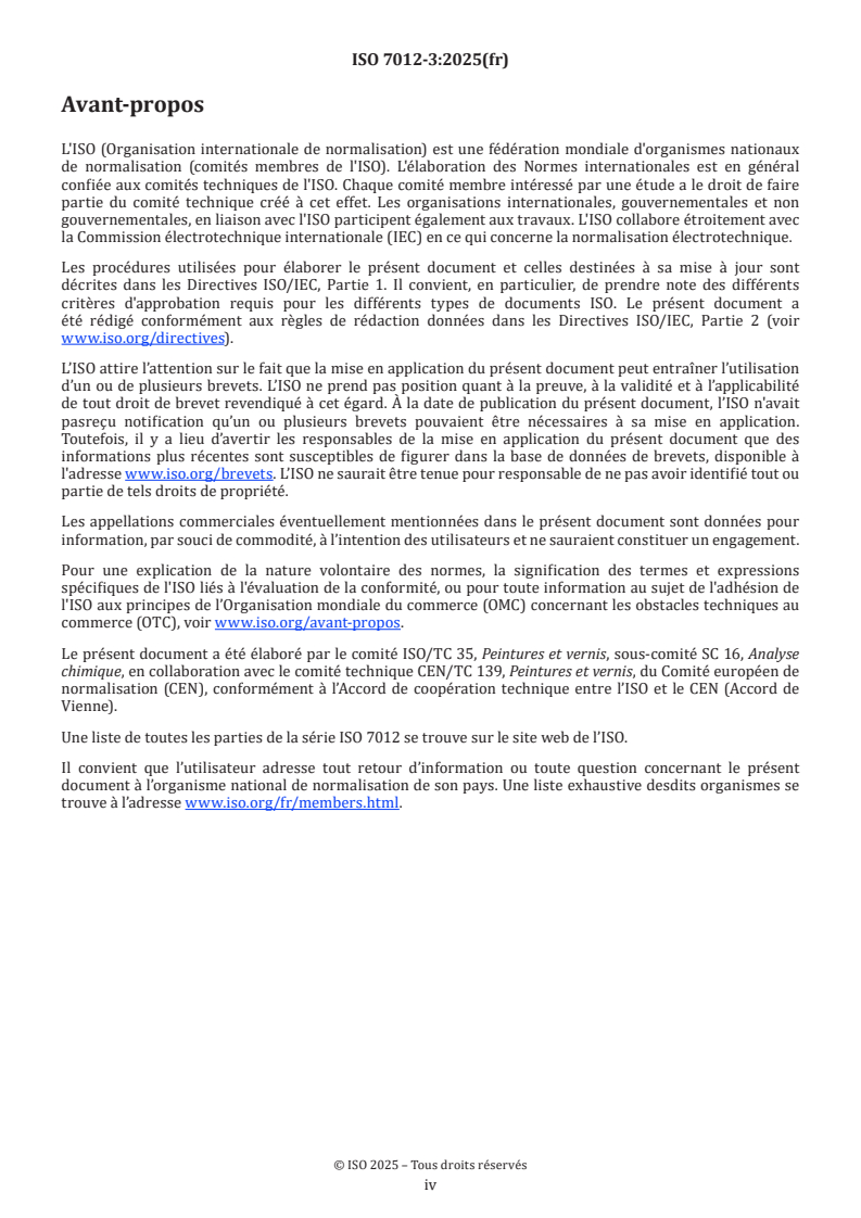 ISO 7012-3:2025 specifies analytical methods for the determination of in-can isothiazolinone preservatives in water-dilutable coating materials (paints and varnishes) and related products, including polymer dispersions. The standard defines required apparatus, sample preparation and extraction, and chromatographic determination using liquid chromatography with UV/VIS detection (LC-UV/DAD) and liquid chromatography coupled to mass spectrometry (LC‑MS or LC‑MS/MS). Applicable ionization techniques include electrospray (ESI) and atmospheric pressure chemical ionization (APCI).