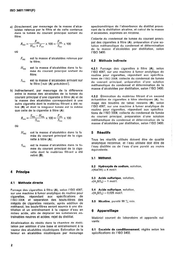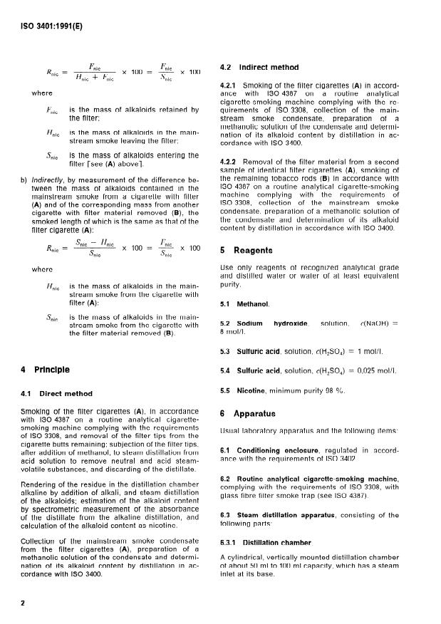 ISO 3401:1991 - Cigarettes - Determination of alkaloid retention by the filters - Spectrometric method - specifies two spectrometric procedures (a direct method and an indirect method) for measuring the alkaloids retained by cigarette filters, expressed as nicotine. The standard describes principle, reagents, apparatus, sampling, test procedures, calculation of results and reporting. The direct method is preferred except where filter materials (for example some charcoal filters) prevent complete recovery; the indirect method has limitations (not suitable for cigarettes with perforated or porous filter tipping wraps).