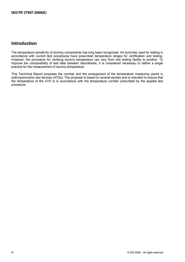 ISO/TR 27957:2008 is a technical report published by the International Organization for Standardization (ISO). Its full title is "Road vehicles — Temperature measurement in anthropomorphic test devices — Definition of the temperature sensor locations". This standard covers: ISO 27957:2008 defines the number and the arrangement of temperature measuring points for anthropomorphic test devices (ATDs), in order to ensure that the temperature of the ATD is in accordance with the temperature corridor prescribed by the applied test procedure.