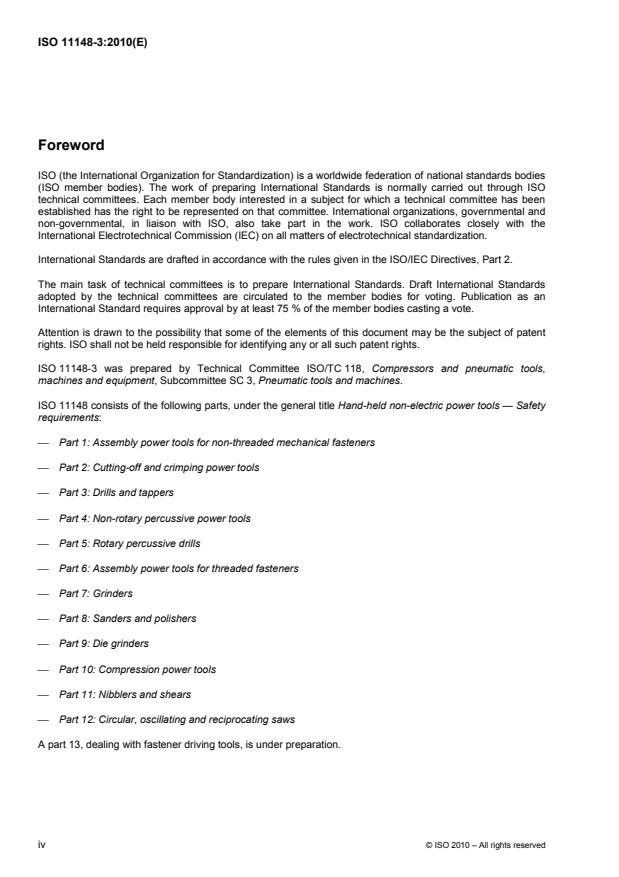 ISO 11148-3:2010 is a standard published by the International Organization for Standardization (ISO). Its full title is "Hand-held non-electric power tools — Safety requirements — Part 3: Drills and tappers". This standard covers: ISO 11148-3:2010 applies to hand-held non-electric power tools (hereafter referred to as “drills and tappers”) intended for rotary drilling of holes in all kinds of material, e.g. wood, metal, concrete, plastics, etc., or for tapping and cleaning threads in metal and plastics. The drills and tappers can be powered by compressed air, hydraulic fluid or internal combustion engines and are intended for use by one operator and supported by the operator's hand or hands, with or without a suspension, e.g. a balancer. ISO 11148-3:2010 is applicable to drills, heavy duty drills with two handles and tappers. Examples of drills and tappers covered by ISO 11148-3:2010 are shown. ISO 11148-3:2010 is not applicable to special requirements and modifications of drills and tappers for the purpose of mounting them in fixtures. ISO 11148-3:2010 deals with all significant hazards, hazardous situations or hazardous events when drills and tappers are used as intended and under conditions of misuse that are reasonably foreseeable by the manufacturer, with the exception of their use in potentially explosive atmospheres.