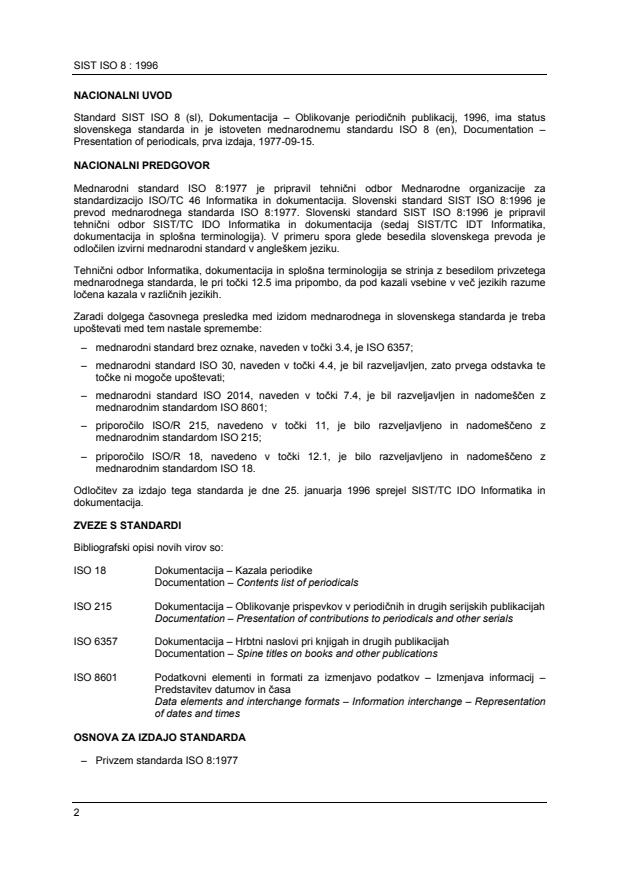 ISO 8:1977 is a standard published by the International Organization for Standardization (ISO). Its full title is "Documentation — Presentation of periodicals". This standard covers: Sets out rules intended to enable editors and publishers to present periodicals in a form which will facilitate their use. Following these rules should help editors and publishers to bring order and clarity to their own work. These requirements are of varying importance and some may go against certain artistic, technical or advertising considerations.