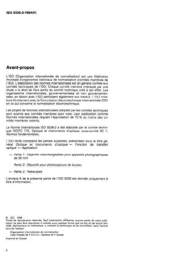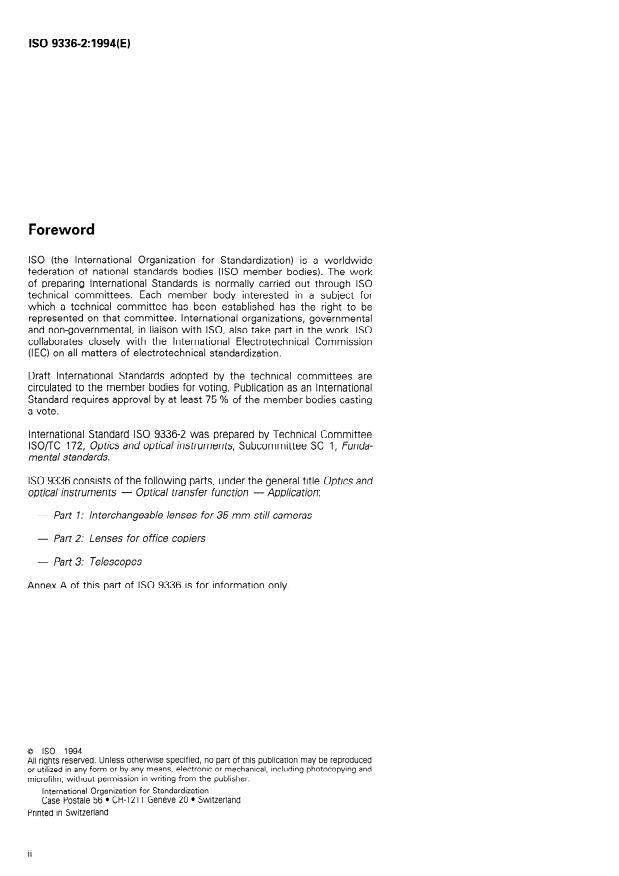 ISO 9336-2:1994 is a standard published by the International Organization for Standardization (ISO). Its full title is "Optics and optical instruments — Optical transfer function — Application — Part 2: Lenses for office copiers". This standard covers: Specifies a method of testing lenses for office copiers in terms of imaging states aimed at making valid optical transfer function measurements.