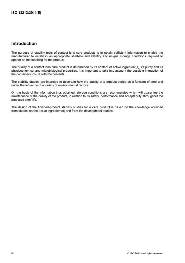 ISO 13212:2011 provides guidance on the design of stability studies for use in gathering information to enable determination of the shelf-life of contact lens care products. ISO 13212:2011does not address studies designed to obtain information to establish the in-use stability (i.e. notice of discard date) of contact lens care products.