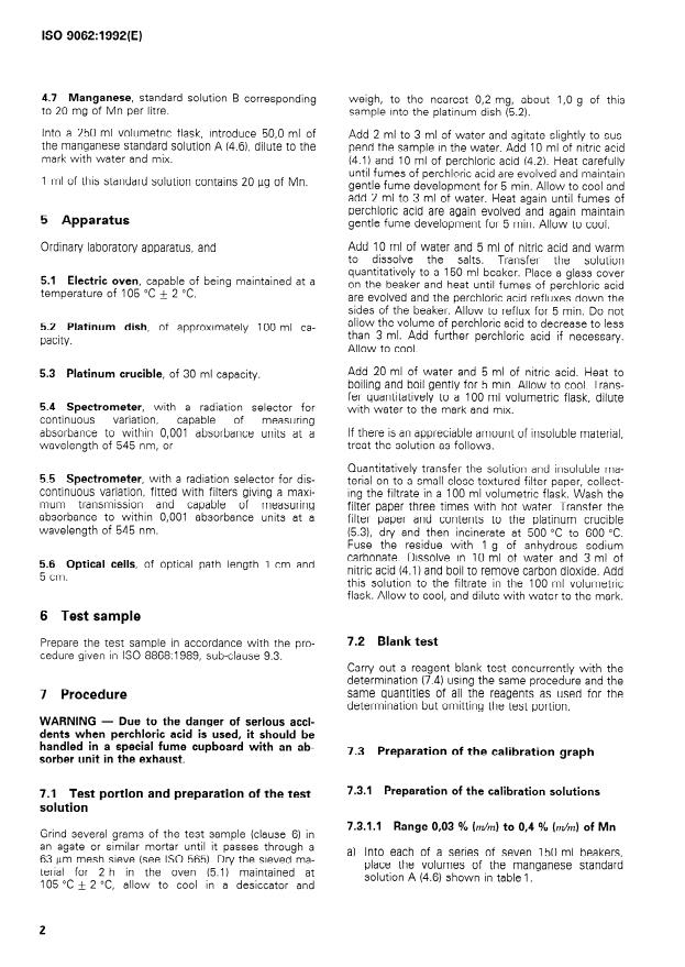 ISO 9062:1992 is a standard published by the International Organization for Standardization (ISO). Its full title is "Acid-grade and ceramic-grade fluorspar — Determination of manganese content — Periodate spectrometric method". This standard covers: Applicable to products having Mn-contents in the range 0,006 % to 0,4 %. Decomposition of the test portion with nitric and perchloric acids. After dilution follows oxidation of manganese to permanganate with sodium metaperiodate. Spectrometric measurement at 545 nm.