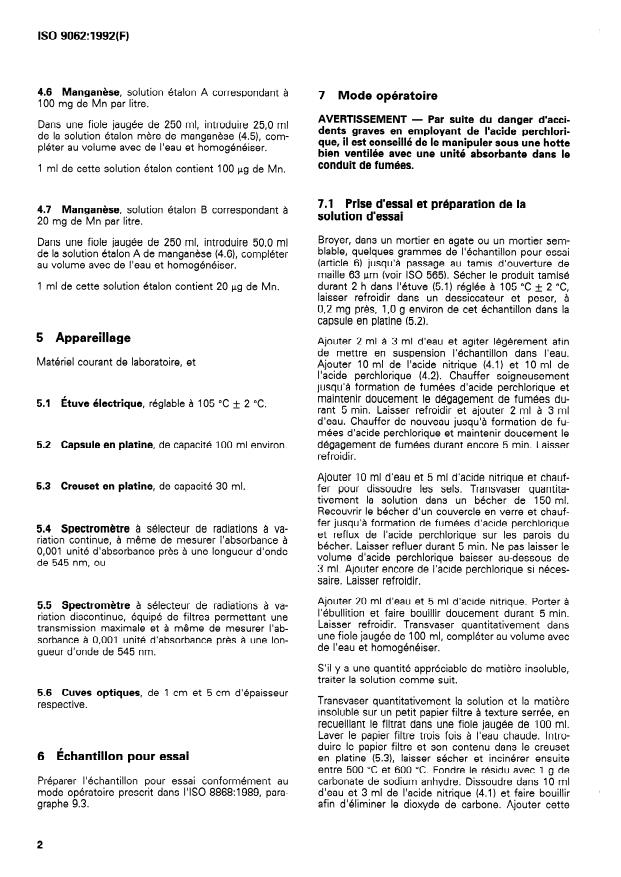 1 ml de cette solution étalon contient 20 pg de Mn. durant 2 h dans I’etuve (5.1) réglée a 105 “C + 2 OC,