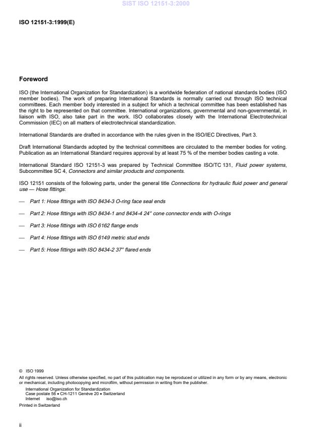 ISO 12151-3:1999 is a standard published by the International Organization for Standardization (ISO). Its full title is "Connections for hydraulic fluid power and general use — Hose fittings — Part 3: Hose fittings with ISO 6162 flange ends". This standard covers: Connections for hydraulic fluid power and general use — Hose fittings — Part 3: Hose fittings with ISO 6162 flange ends