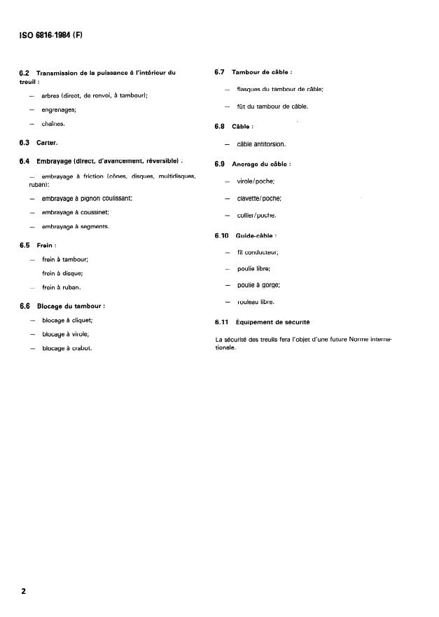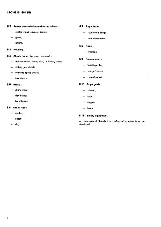 ISO 6816:1984 is a standard published by the International Organization for Standardization (ISO). Its full title is "Machinery for forestry — Winches — Classification and nomenclature". This standard covers: Establishes the classification of the major types of winches and rope anchors and the nomenclature for major components and parts peculiar to these machines. Examples used here are not intended to include all existing commercial machines nor to be descriptive of any particular machine. Applies to winches attached to machines used in forestry operations, for example on skidders. Specifically excluded are winches used for hoisting operations on cranes, draglines, high lead logging and yarding.