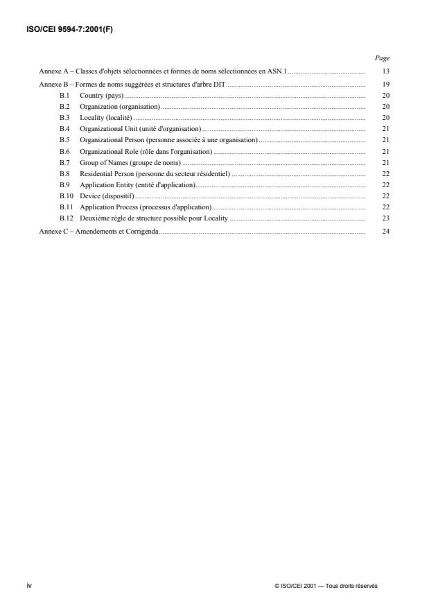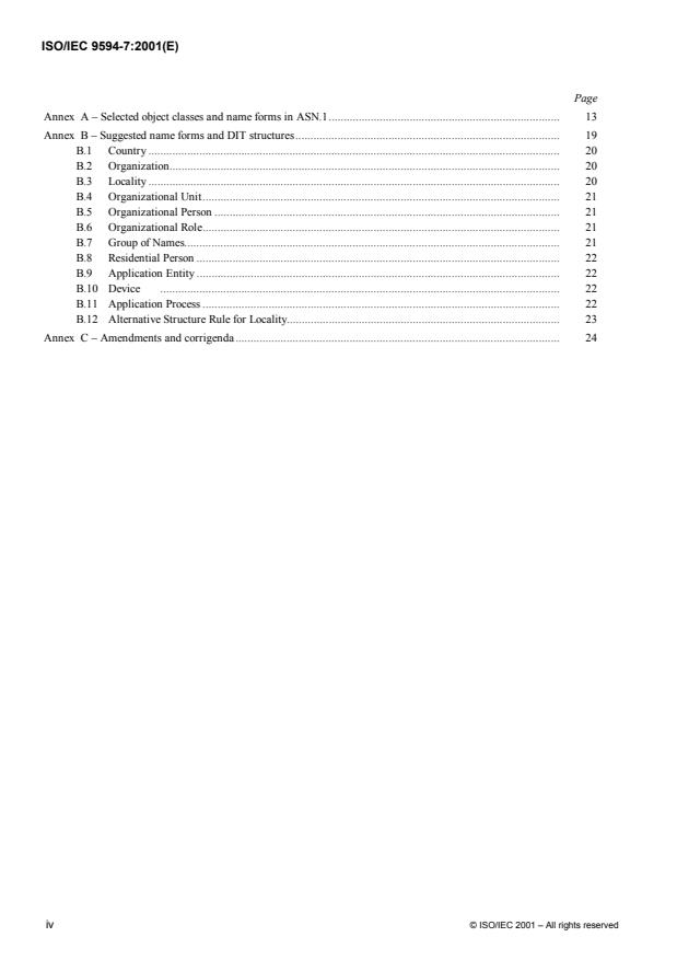 ISO/IEC 9594-7:2001 defines a number of selected object classes and name forms which may be found useful across a range of applications of the Directory. An object class definition specifies the attribute types which are relevant to the objects of that class. A name form definition specifies the attributes to be used in forming names for the objects of a given class.