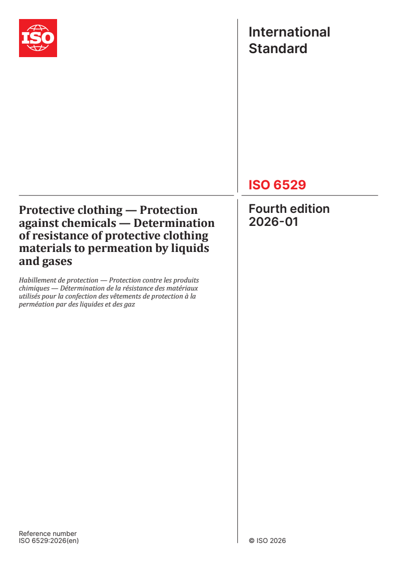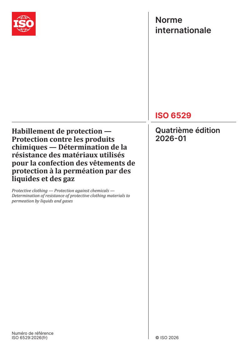 ISO 6529:2026 - Habillement de protection — Protection contre les produits chimiques — Détermination de la résistance des matériaux utilisés pour la confection des vêtements de protection à la perméation par des liquides et des gaz Released:23. 01. 2026