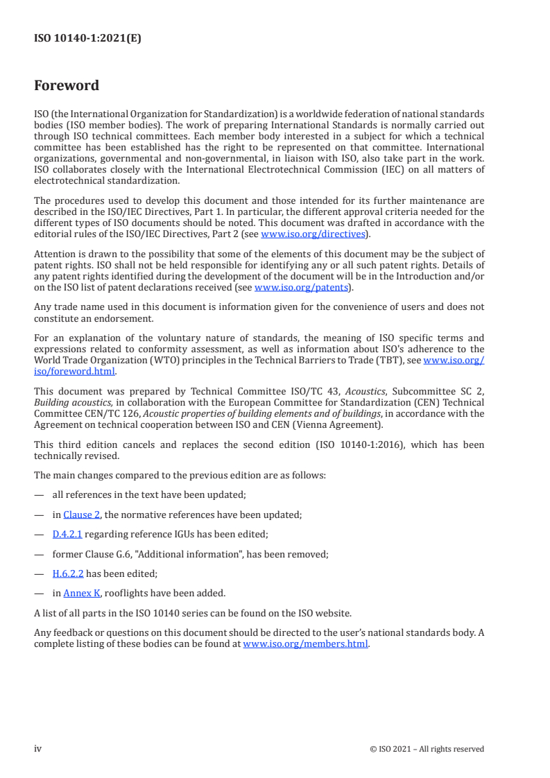 ISO 10140-1:2021 is a standard published by the International Organization for Standardization (ISO). Its full title is "Acoustics — Laboratory measurement of sound insulation of building elements — Part 1: Application rules for specific products". This standard covers: This document specifies test requirements for the laboratory measurement of the sound insulation of building elements and products, including detailed requirements for the preparation and mounting of the test elements, and for the operating and test conditions. It also specifies the applicable quantities, and provides additional test information for reporting. The general procedures for airborne and impact sound insulation measurements are given in ISO 10140‑2 and ISO 10140-3, respectively.