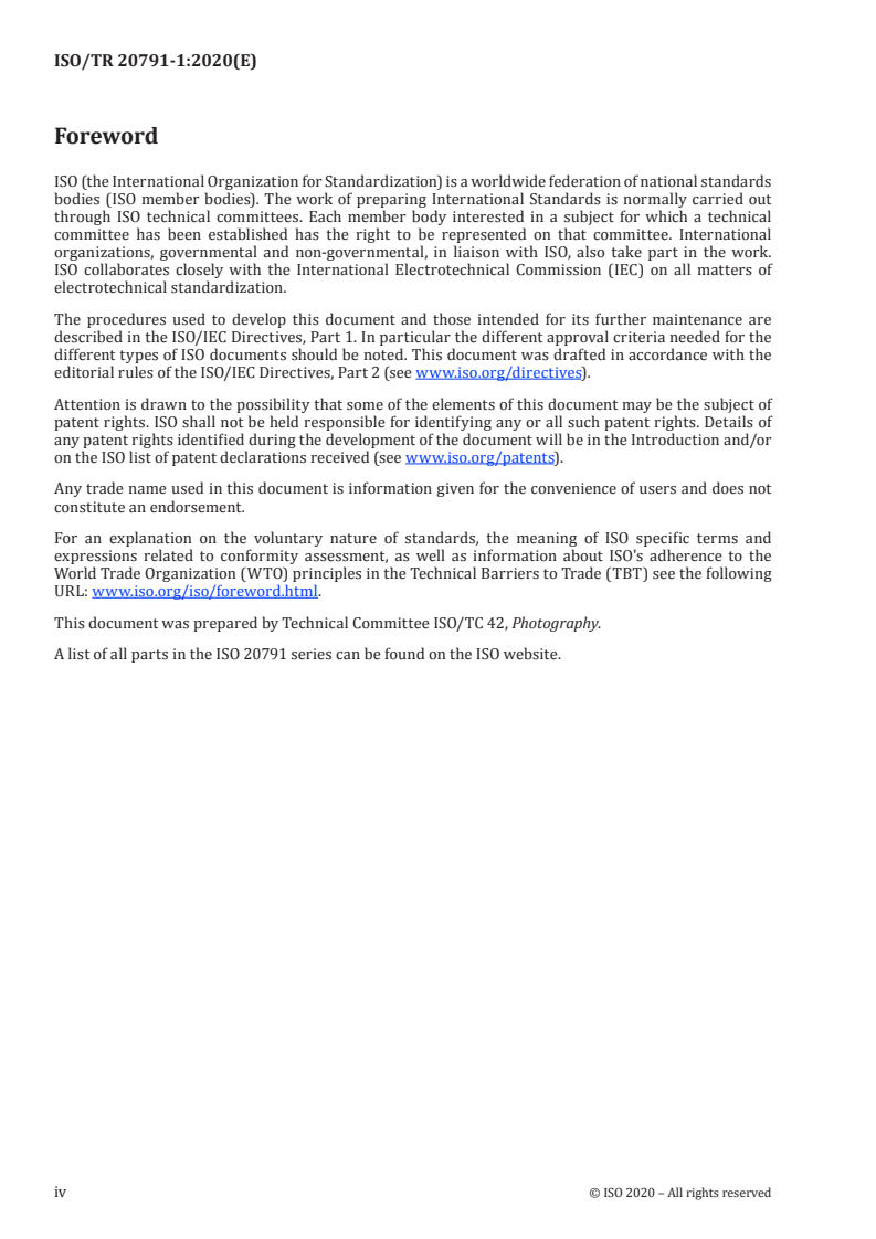 - The report references related work by ISO/TC 42 (Photography) and notes applicability of standards from ISO/IEC JTC 1/SC 28 and ISO/TC 130 where common imaging measurement methods exist. ISO/TC 42 also plans additional test targets and related parts in the ISO 20791 series.