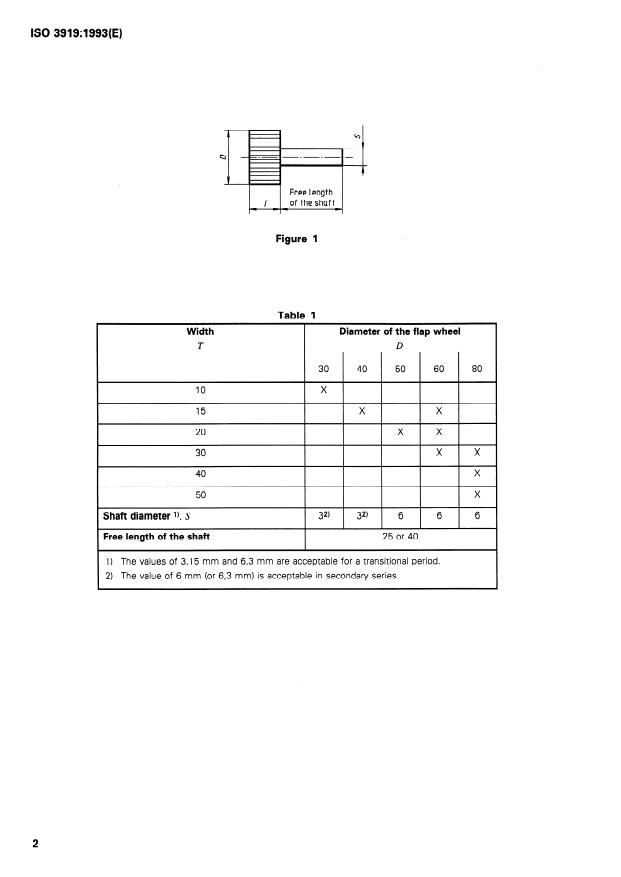 ISO 3919:1993 is a standard published by the International Organization for Standardization (ISO). Its full title is "Coated abrasives — Flap wheels with shafts — Dimensions and designation". This standard covers: Specifies the dimensions (diameter, width, shaft diameter, free length of shaft), in millimetres, of flap wheels with shafts and their designation.